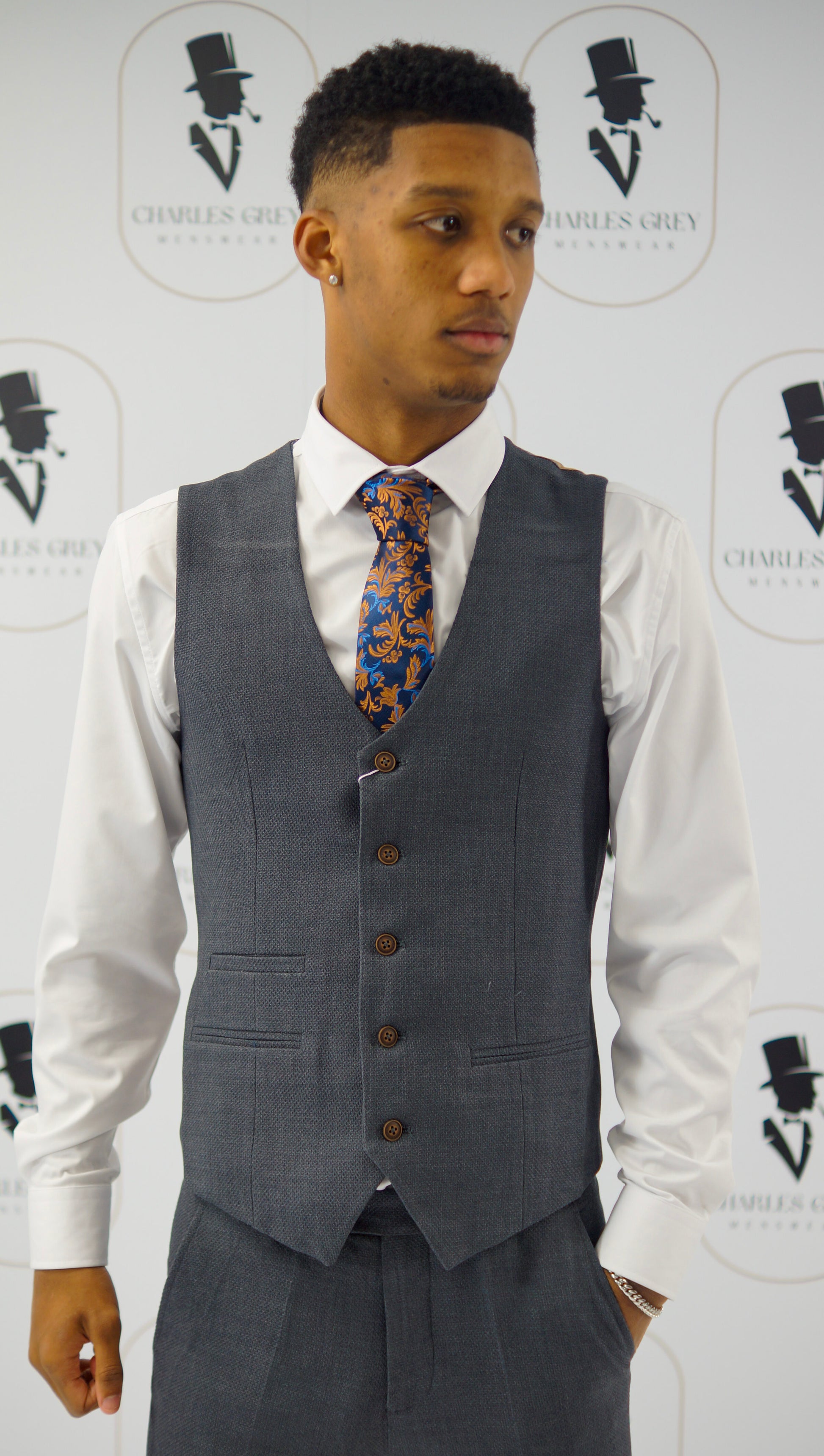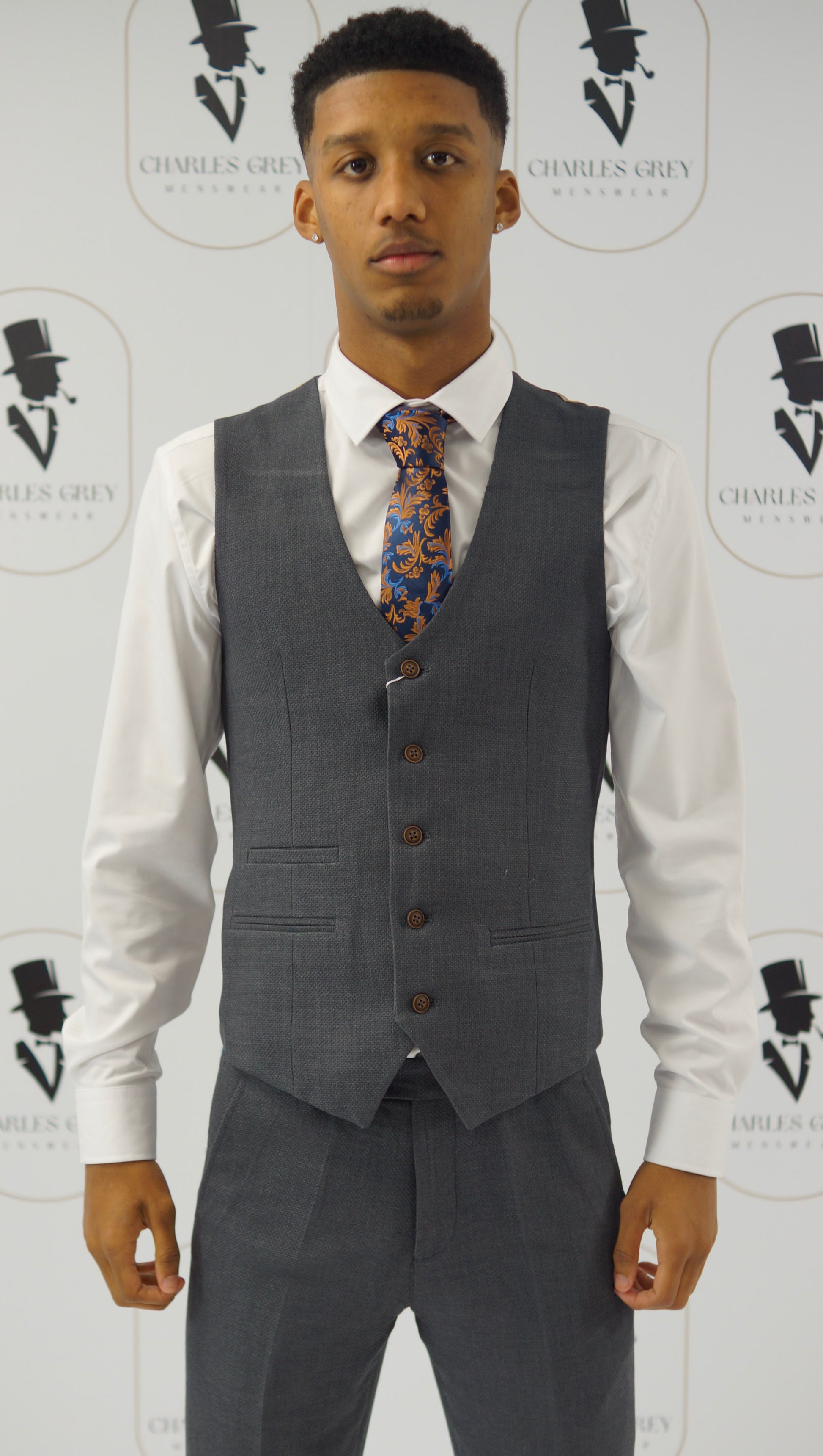 Our newest addition to the collection, the Charlton Grey oozes elegance this luxury grey textured fabric is the perfect wedding suit mixed with tonal brown buttons.